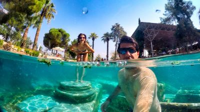 Roma döneminden kalma sütun parçalarının arasında yüzme deneyimi sunan Kleopatra Antik Havuzu, bölgenin en ilgi çekici duraklarından biridir. Jeotermal suyun sıcaklığı yıl boyunca yaklaşık 36 derece olup, hem rahatlatıcı hem de tarihi bir atmosferde keyif yapma imkânı sunar. Giriş ücreti travertenlerden ayrı olarak alınmaktadır.
